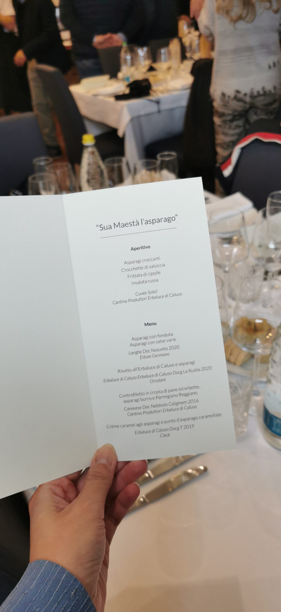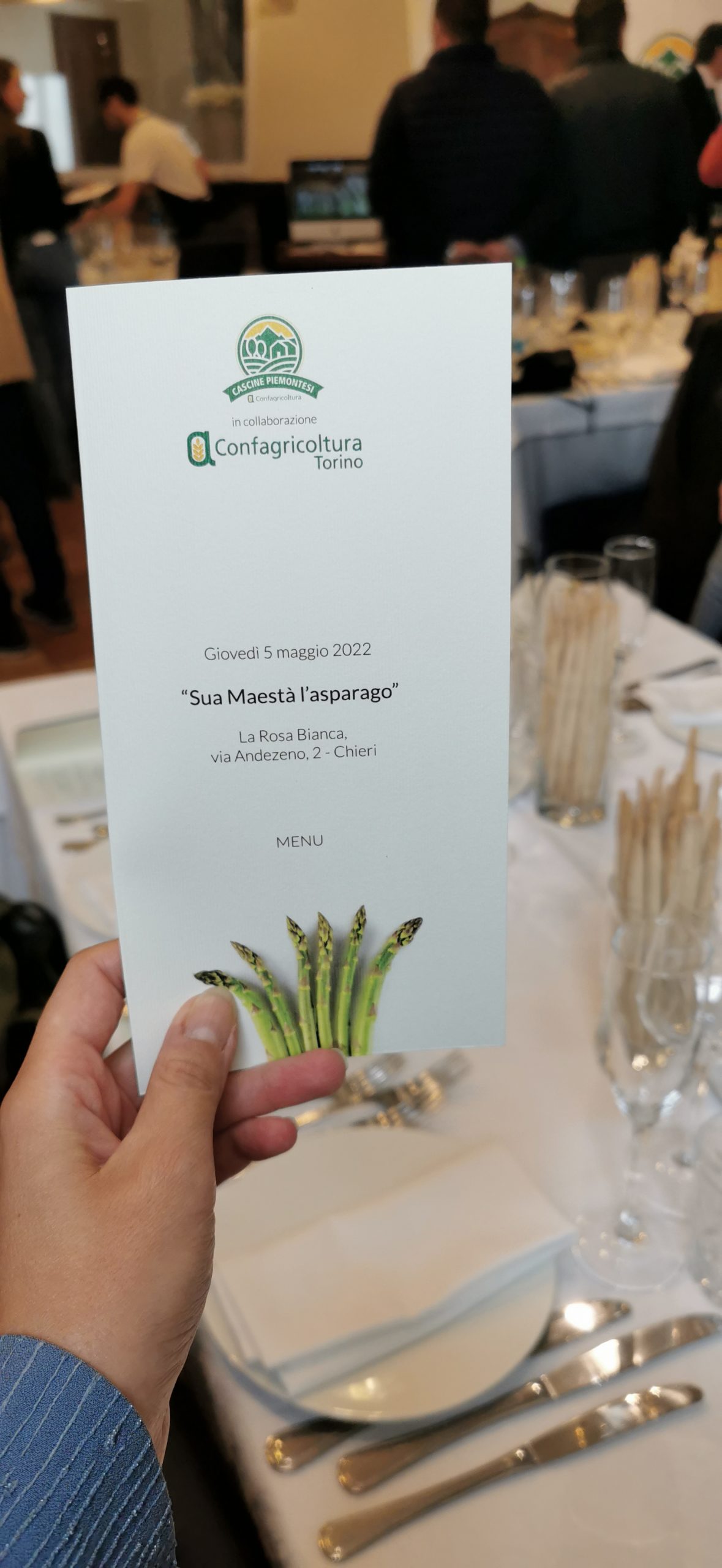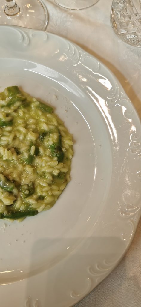 Ma dopo questa gloriosa presentazione veniamo al menù dell’evento in cui, ospite del ristorante “La rosa bianca” di Chieri, ho avuto il piacere di provare l’asparago dall’antipasto al dolce.