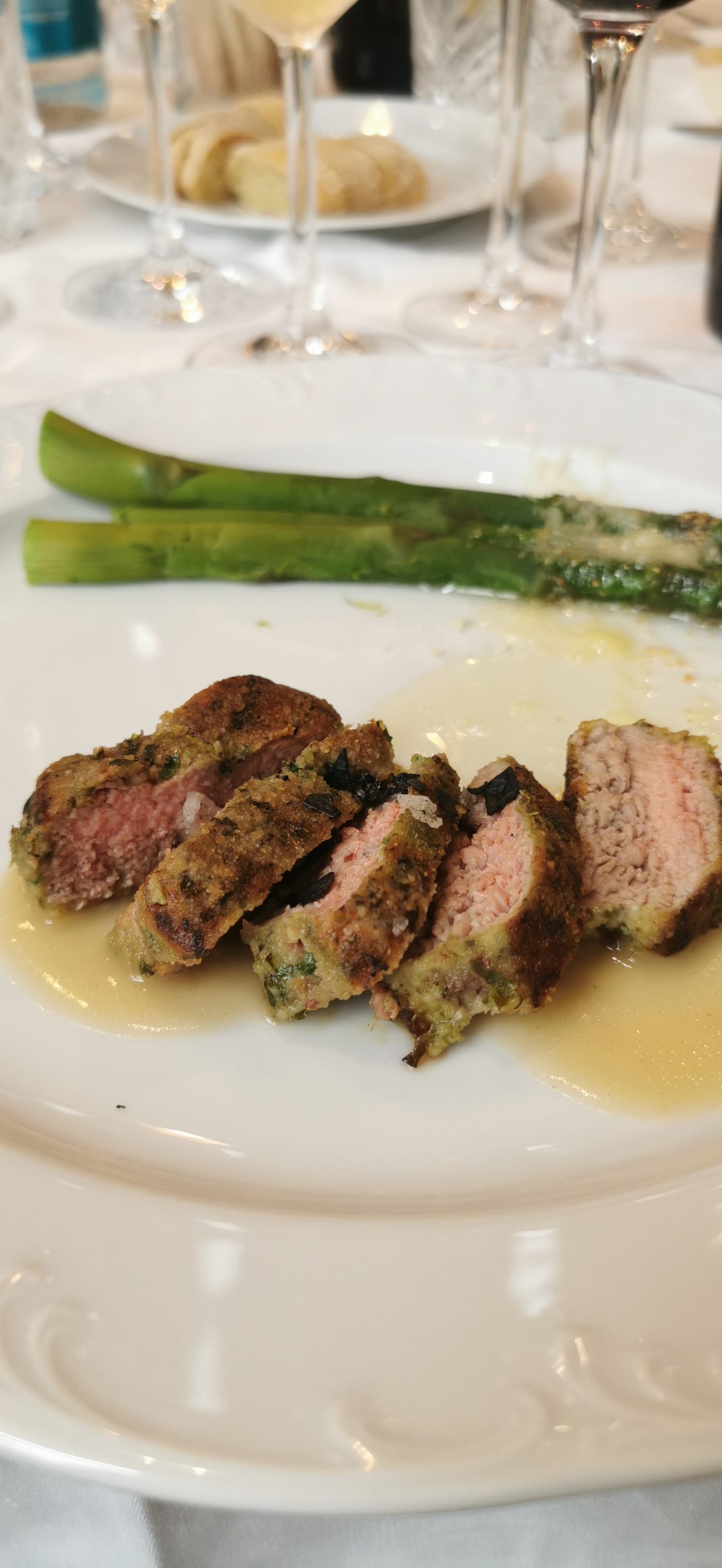 Abbiamo proseguito con un controfiletto in crosta di pane ed erbette, e qui gli asparagi sono stati serviti classicamente con burro e Parmigiano Reggiano.