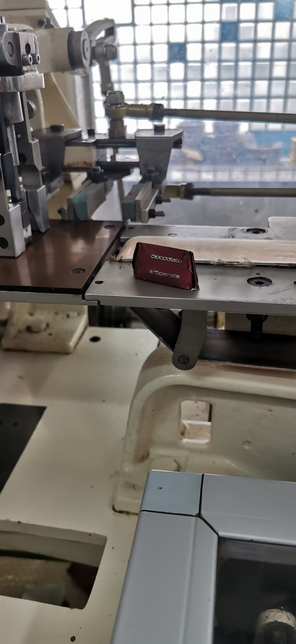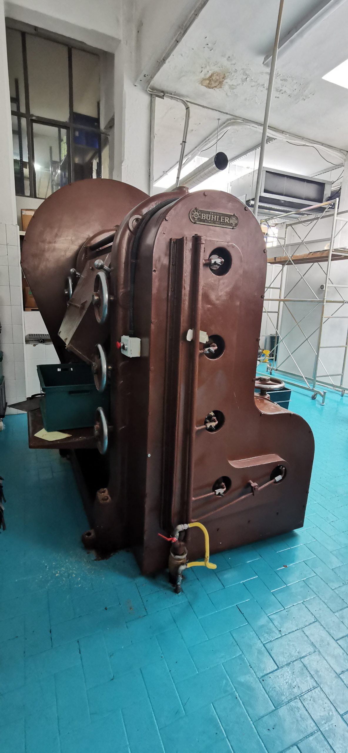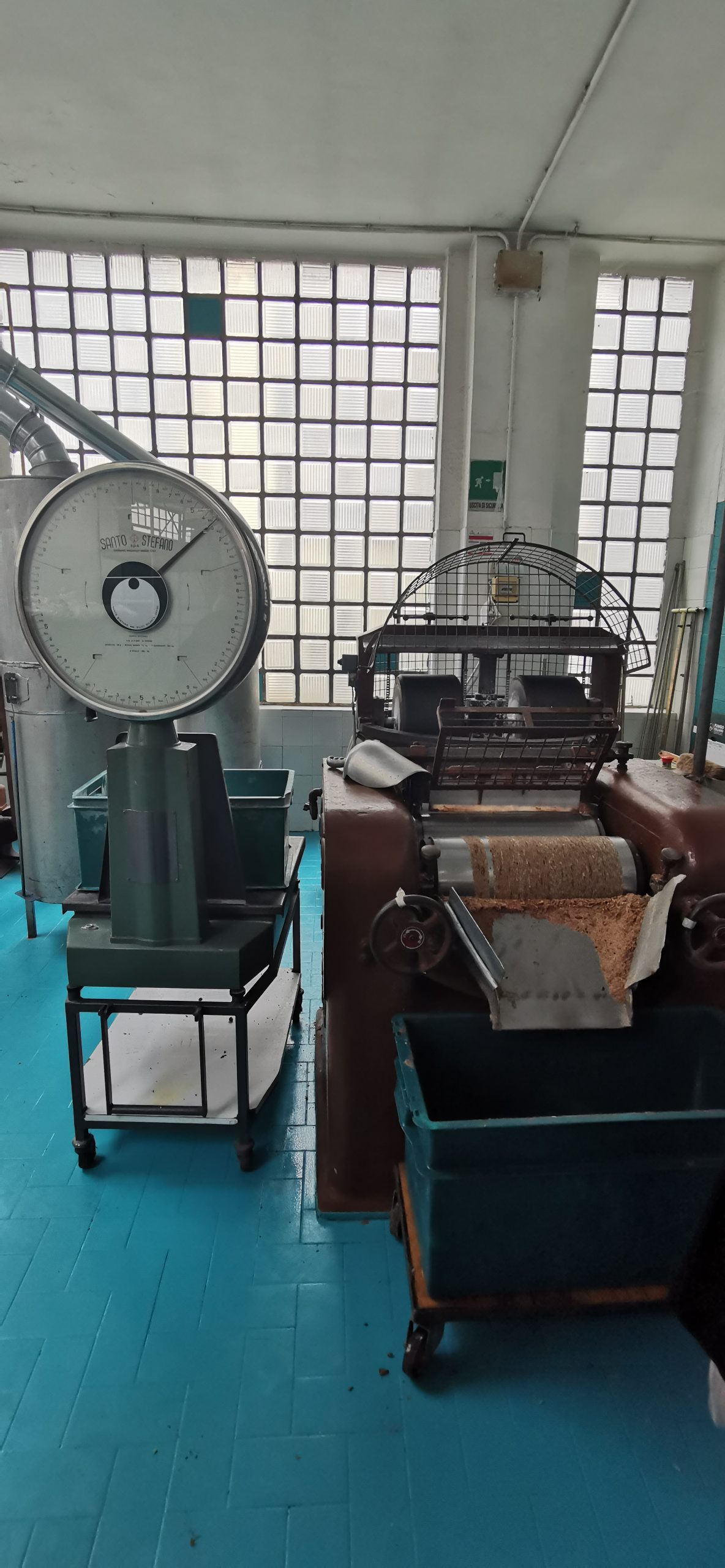 Tutto parte dalla massa di cacao e dalle coperture di cacao monorigine Ecuador e Ghana, che Sperandri acquista da Callebaut e Varlhona, tra i maggiori fornitori a livello internazionale. Vanto dell’azienda è l’utilizzo della nocciola tonda gentile, usata per molte delle preparazioni. Alcuni dei macchinari utilizzati sono molto antichi, come questa straordinaria taglia-cremini che viene usata in alternativa al taglio manuale con le forbici.