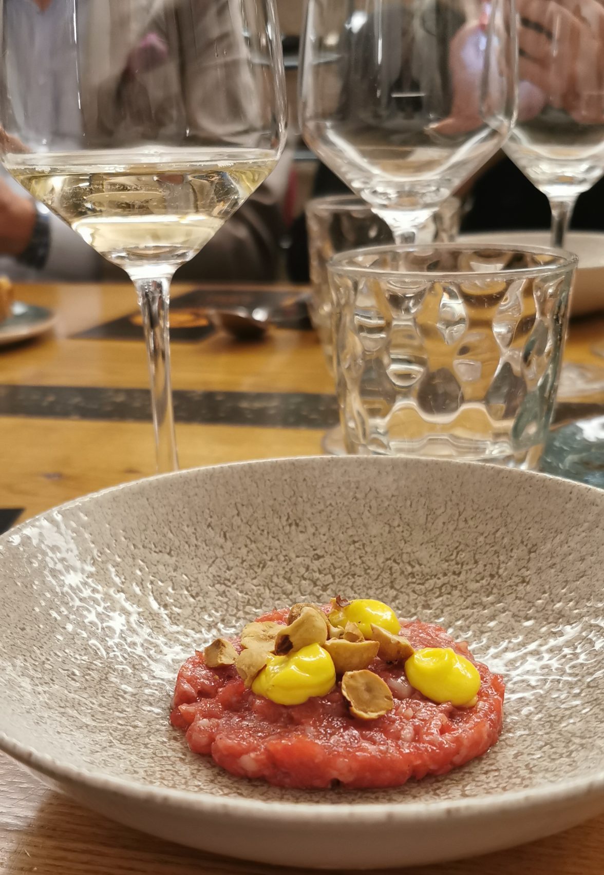 Una salsiccia di Bra con nocciole e maionese di senape e amarillo con il Moncalvina 2023 di Coppo.