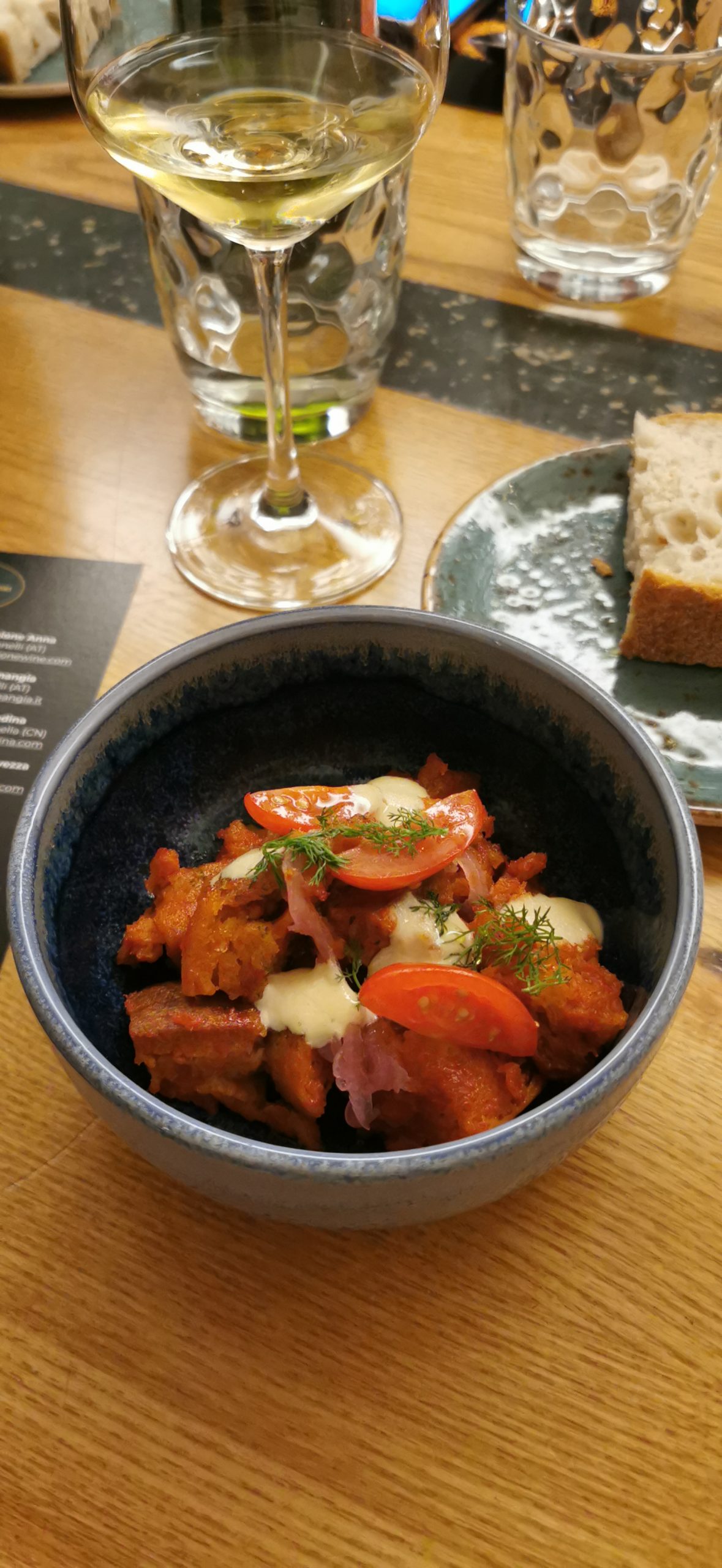 Pane al pomodoro, cipolla di Tropea con crema di Parmigiano reggiano e aneto abbinato al Moscato Canelli 2017 di L’Armangia.