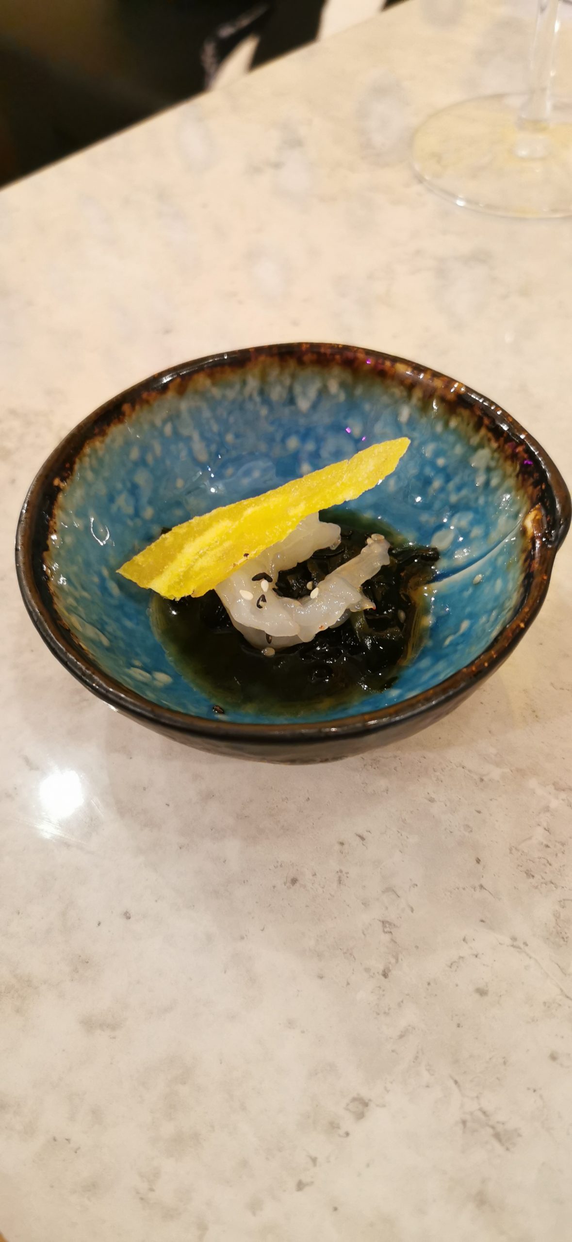Enzo ci ha accolti con un entrée di gambero rosa, alga wakame e salsa ponzu.