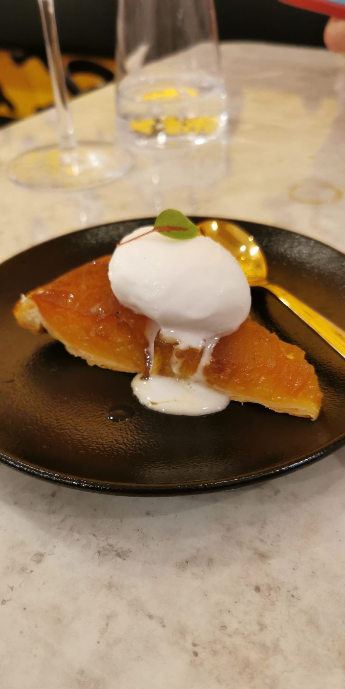 Il viaggio gastronomico da El crab è terminato con un dolce insolito – una panna cotta al tè matcha e mango – e una classica tarte tatin.