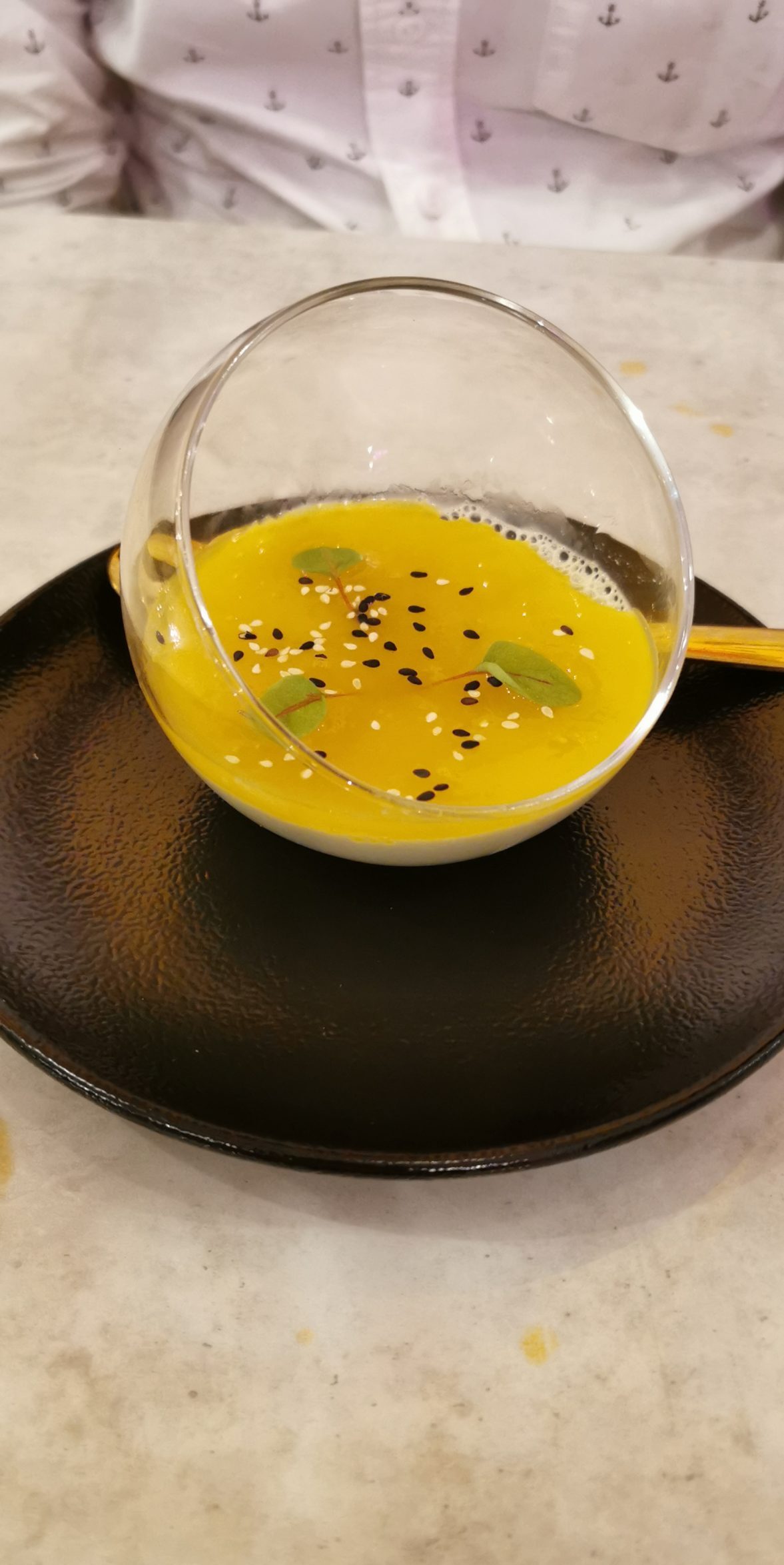 Anche nel secondo Enzo conferma le sue capacità tecniche con la cottura di questo “sudado de pescado” marinato nel miso e servito con un guazzetto nikkei.