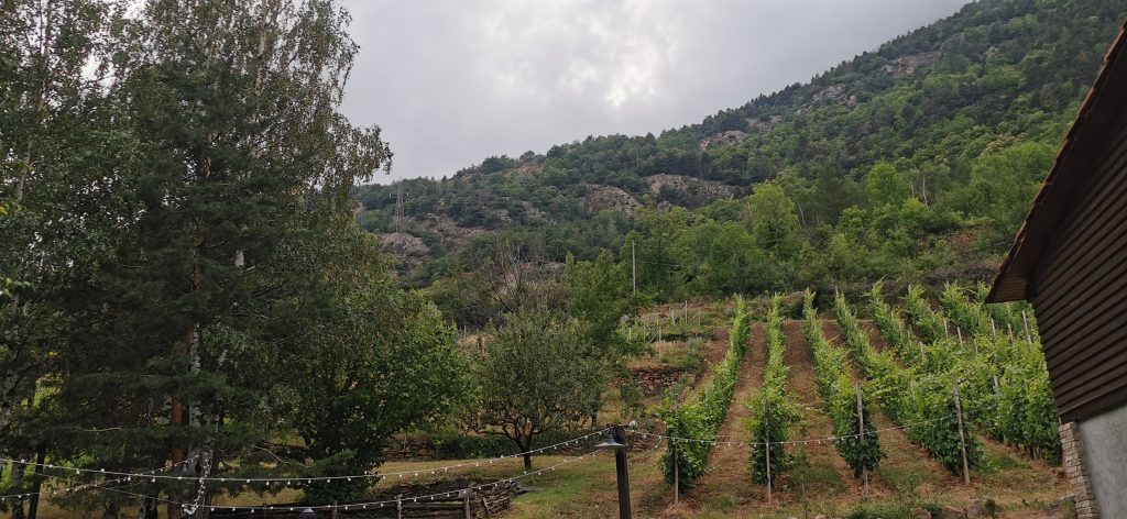 Dopo un’avventurosa camminata per la quale ho capito perché si chiama “viticoltura eroica”, arriviamo nella cantina, immersa in uno scenario suggestivo con la montagna intorno.