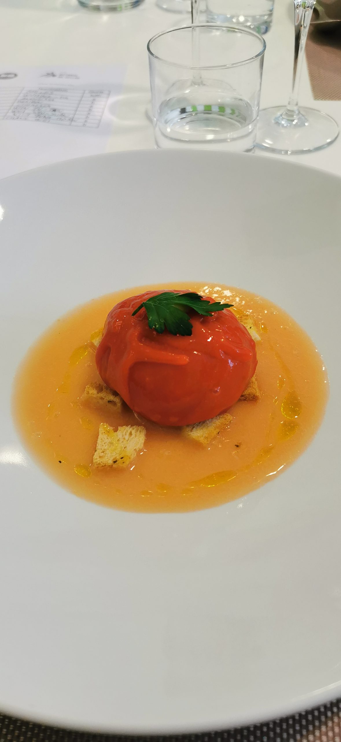 Il primo antipasto è stato realizzato da Carlos Vistavroschi, italo-moldavo. Il suo peperone rivisitato con panzanella liquida è un piatto piacevole alla vista e al palato, a cui mancava solo una piccola spinta sapida per essere eccellente. Una ricetta interessante da provare a replicare anche a casa.
