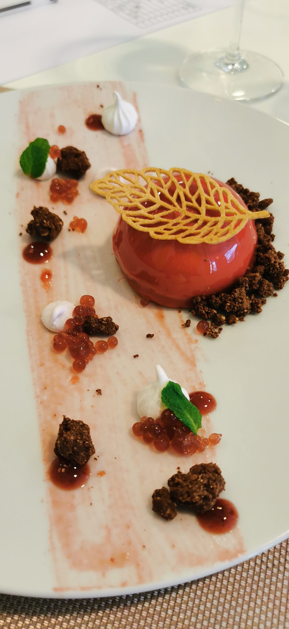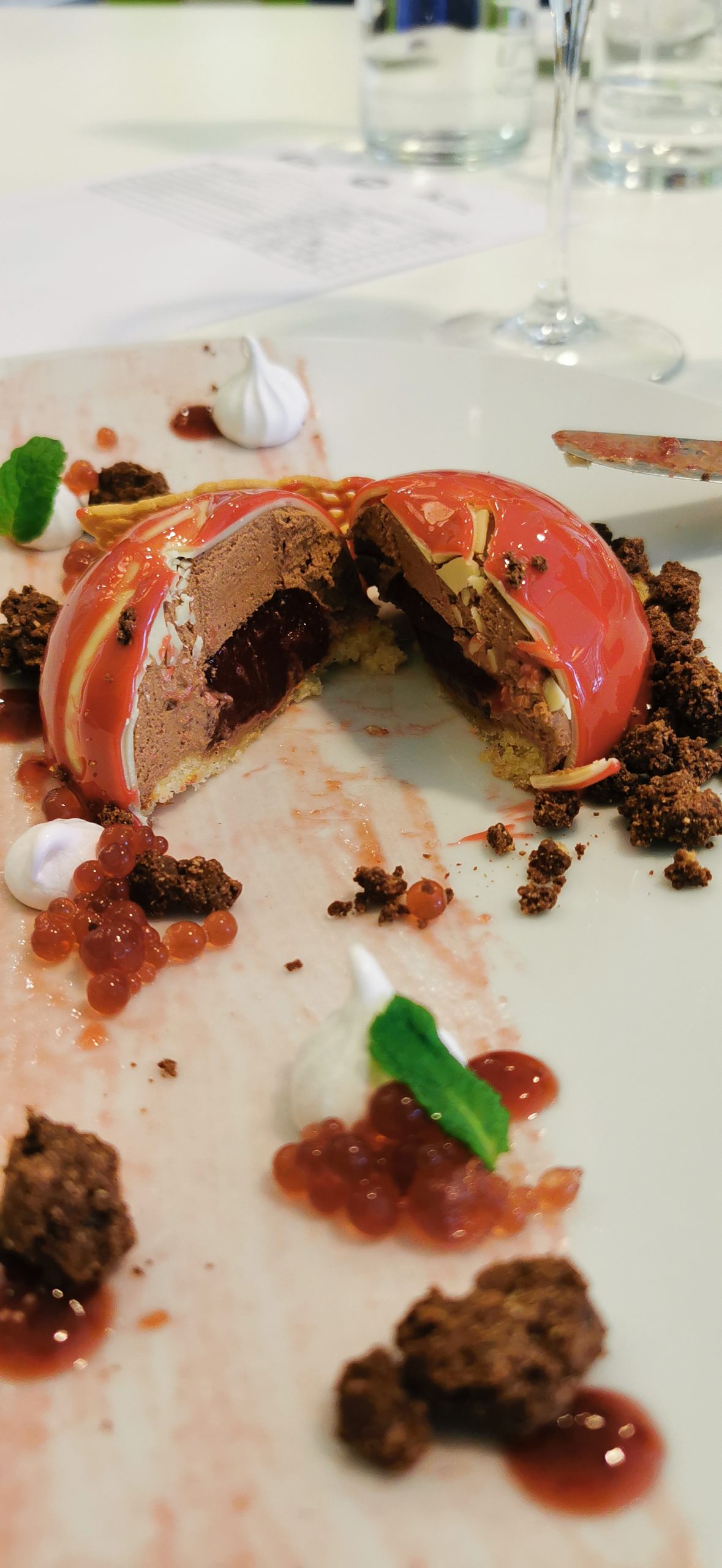 La chiusura in dolcezza è stata entusiasmante. Il dolce realizzato da Yung Mo-Kin (a destra) è un piccolo capolavoro di pasticceria. Una foresta nera con base e crumble al cacao, copertura di cioccolato bianco e salsa ai frutti rossi. Uno scrigno libidinoso in cui la dolcezza del cioccolato bianco – sempre a rischio stucchevolezza – è mitigata dal cacao amaro, dalla croccantezza del crumble e dall’acidità della salsa. E considerato che era la prima volta in cui Kin si cimentava con la preparazione di un dolce, non può che sorprendere doppiamente.