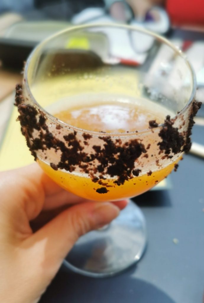 Il secondo cocktail è un punch dal nome divertente che lascia intendere uno degli ingredienti usati. “T’aggiàscordato” è composto da “Gin taggiasco”, lime, sciroppo di fieno, arancia, pimento, aceto balsamico al cioccolato Vignoli e olive taggiasche essiccate. Decisamente complesso e aromatico, è stato abbinato a una caramella di vitello con mousse di caprino, zenzero e germogli Agricooltur.