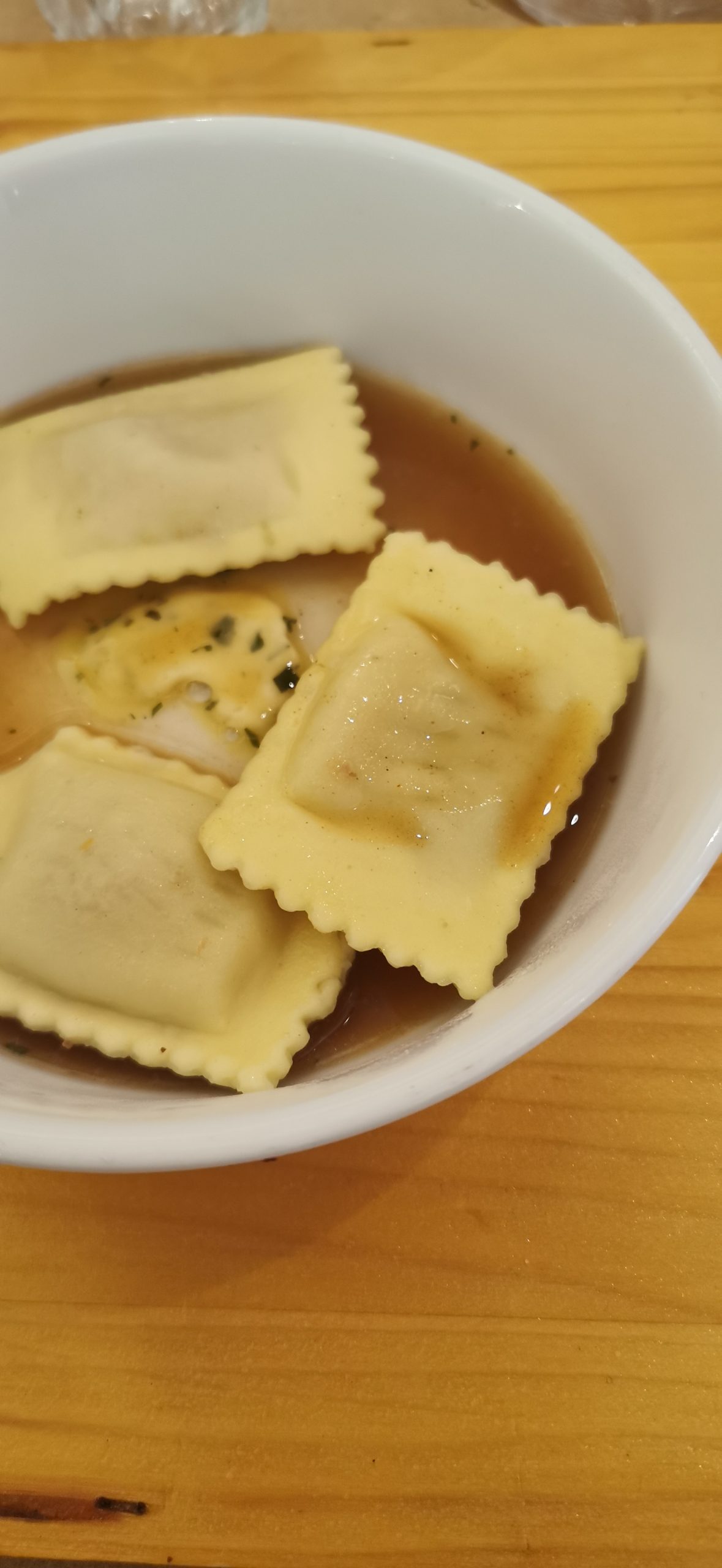 - Ravioli d’oca burro al coriandolo e brodo orientale